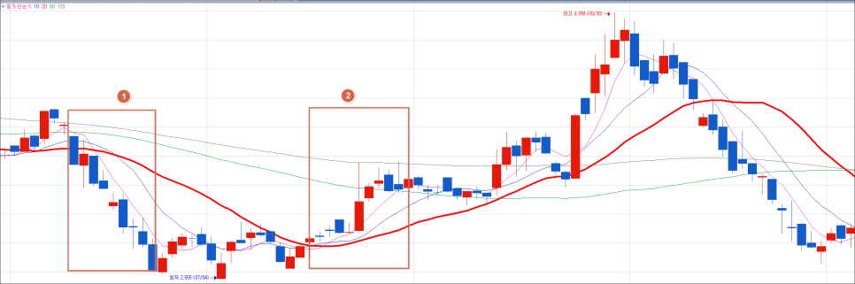 - 이평선들이 좁혀지다가 단기 이평선이 먼저 방향을 틀면 그 방향으로 진입